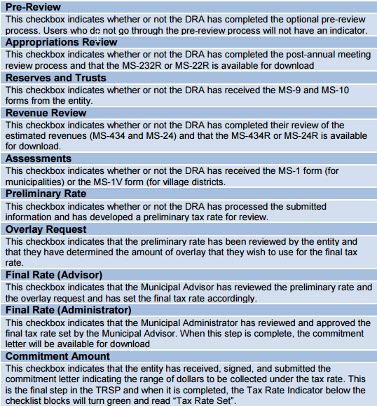 The status checklist is a summary of the mandatory steps or stages of the Tax Rate Setting Process. The list is presented in a linear, dependent order. For example, the “Pre-Review step” must be completed prior to the “Appropriations Review” step. The top checklist (1) is the list of documents and information that must be submitted to the DRA in order to set the tax rate for the entity. The bottom checklist (2) is the steps involved in the setting of the final tax rate. Note that the items on the list and/or the sections will change based on the type of entity or associated entity the user has selected. For example, school districts will not have the second, lower checklist and will have a reduced number of items in the top checklist.